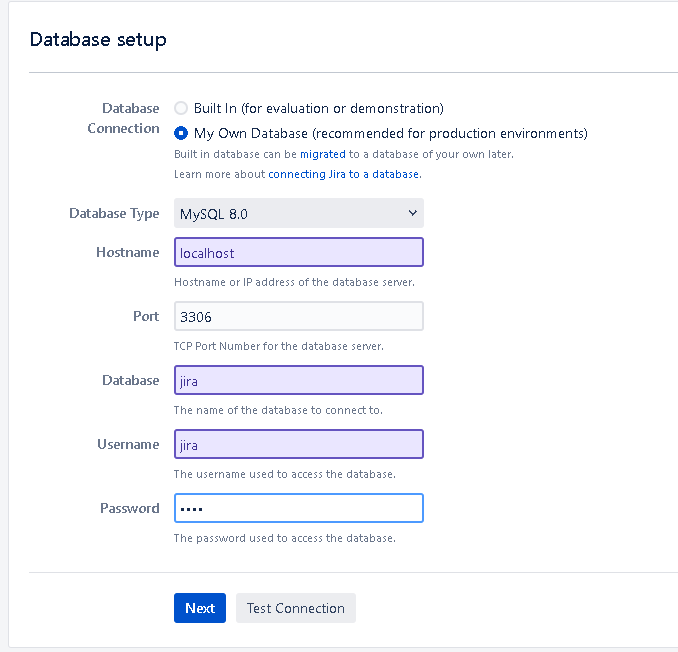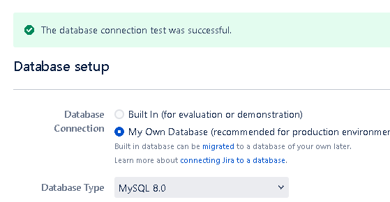 - 앞에서 설정한 mysql을 사용하기 위해서는 아래와 같이 My Own Database를 선택 후 값을 입력한다.